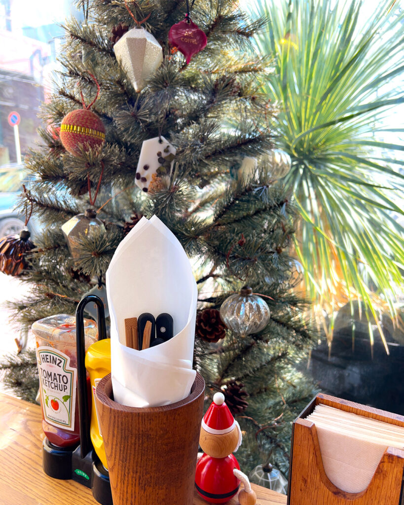 窓際の横並び席に案内してもらい、目の前にはクリスマスツリー🎄
