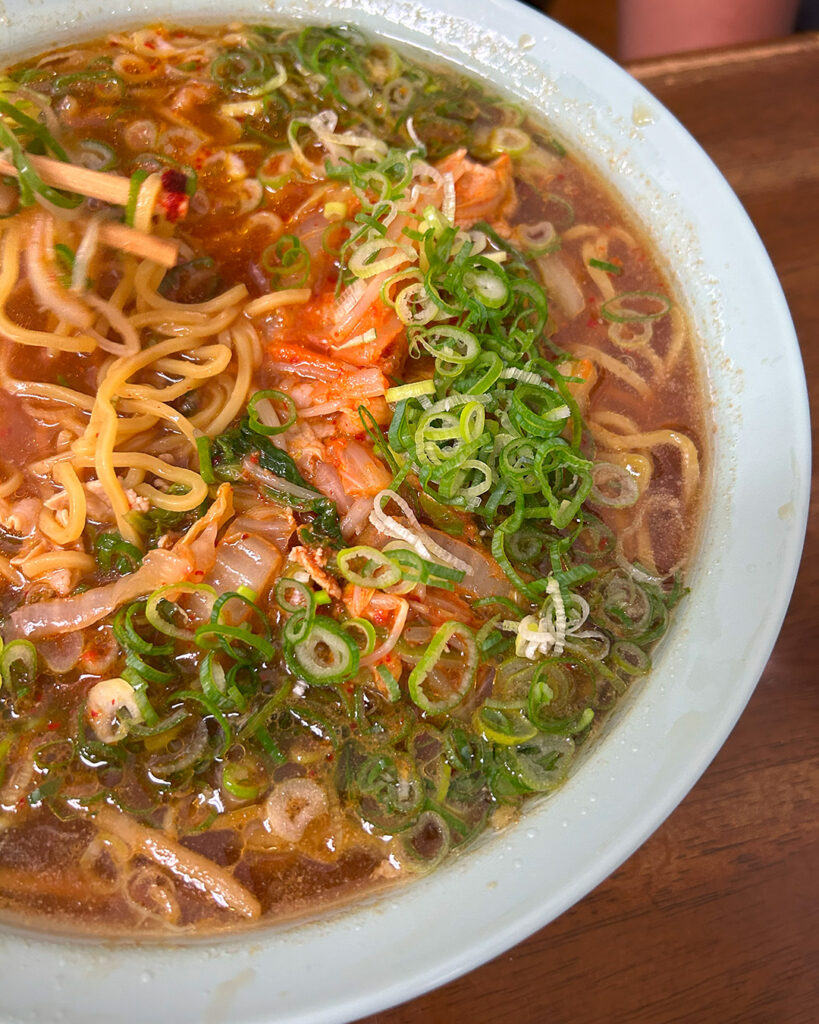 🍜 スタミナラーメンはこってりピリ辛で白菜&ネギが盛り盛り!卓上調味料で味変も楽しめる😋
