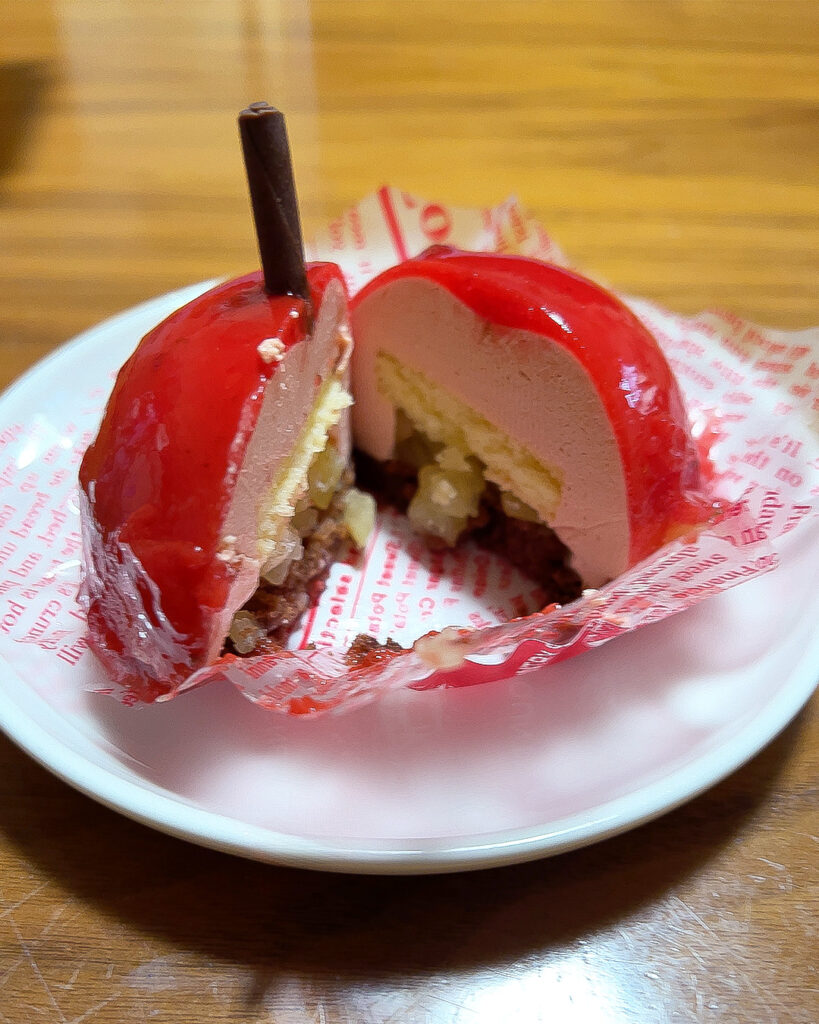 ムースにリンゴのシロップ漬けを合わせ、ツヤツヤの赤いコーティングで仕上げ。まるで本物のリンゴのような見た目で、可愛さも味わいも◎