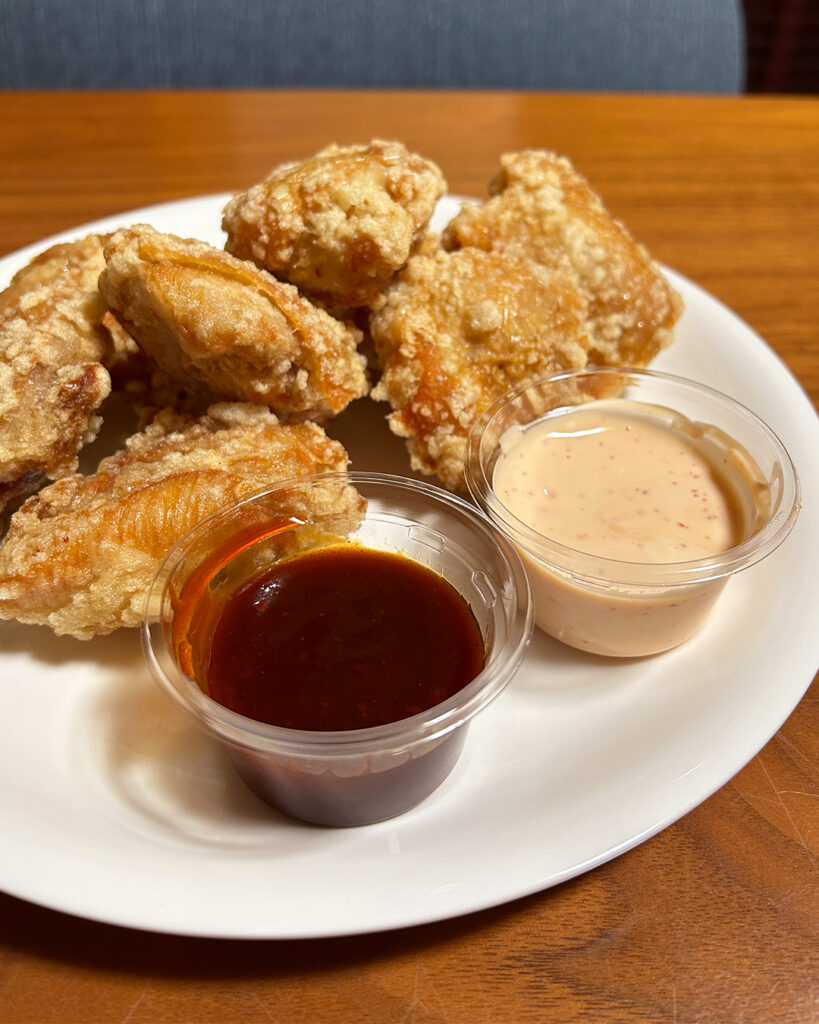 ジューシーなからあげに、つけダレで味変しながら美味しくいただきました😋