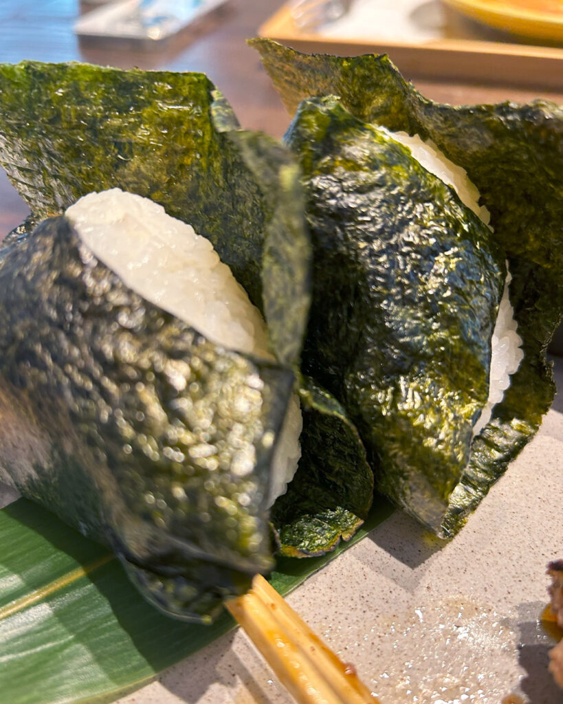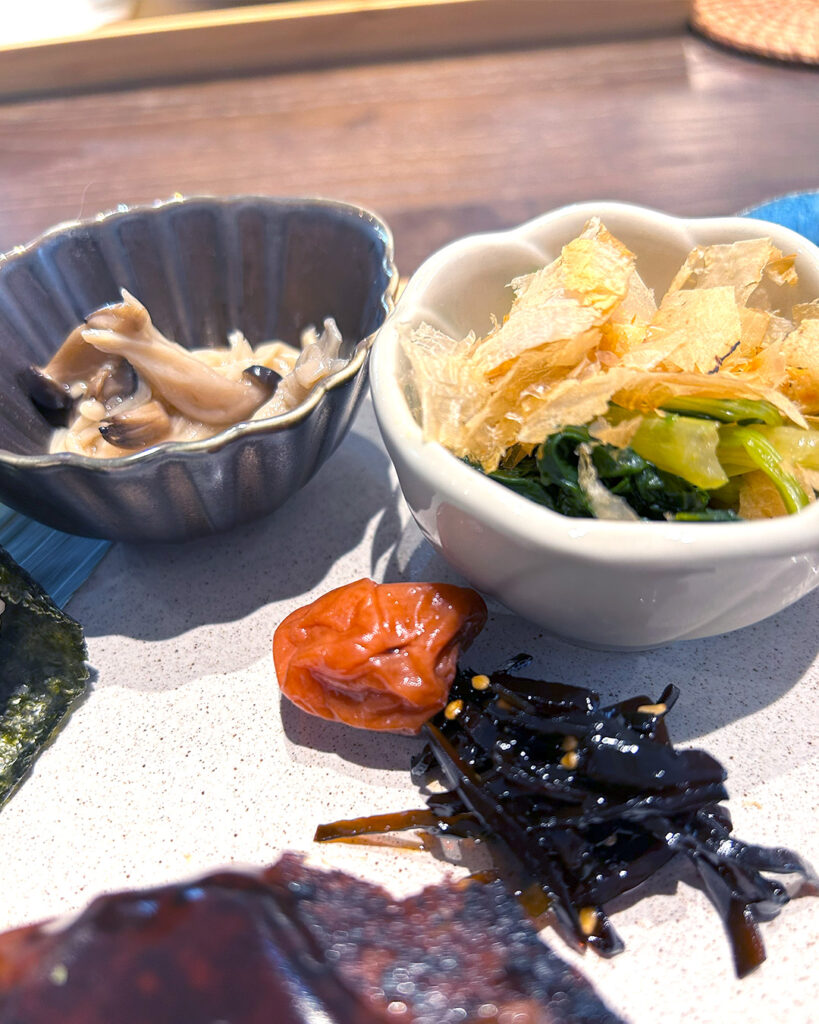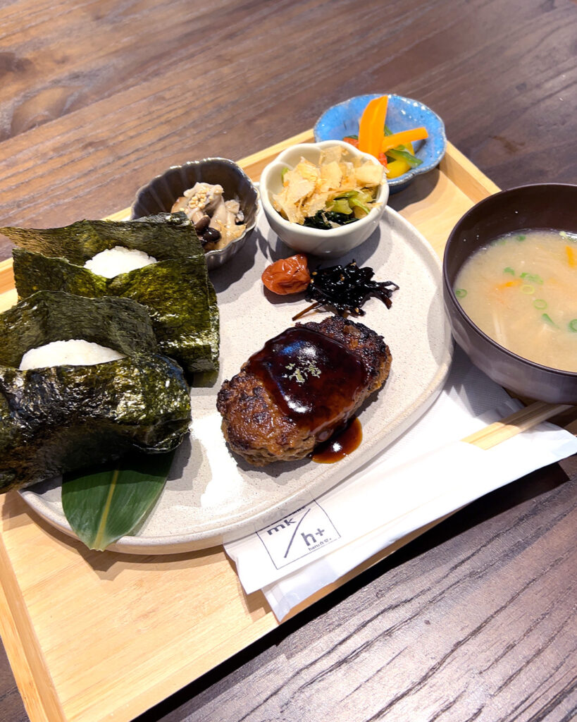 岸和田産のお塩を使ったおむすび2個に、ハンバーグ・お惣菜・お味噌汁付き。