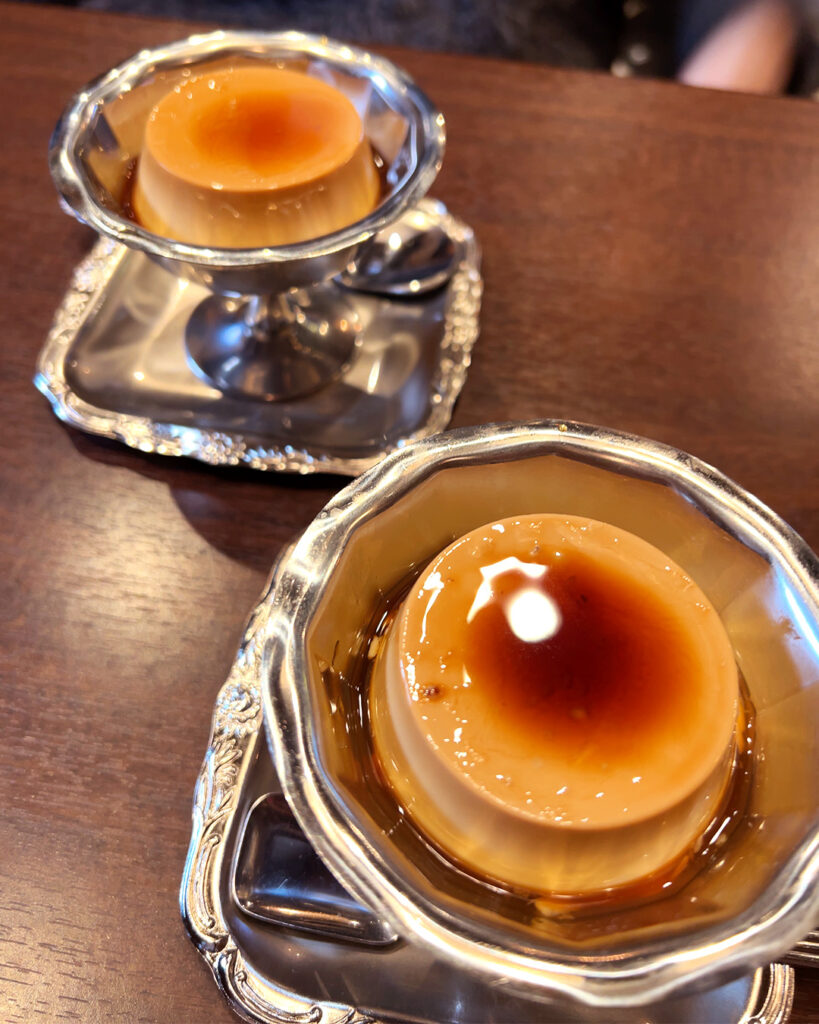 運ばれてきたのは、レトロな食器に盛られたプリンで、細部まで世界観が統一されているのも楽しいポイント。