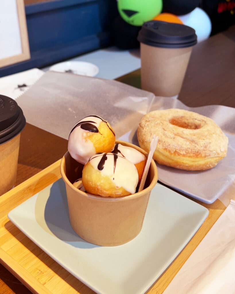 店内はこぢんまりしつつも温かい雰囲気で、ショーケースには可愛いドーナツがずらり。雑貨も置いてあって、見て楽しんでいたら、あったかいドリンクとドーナツを可愛いトレーに乗せて持ってきてくれました☕️
