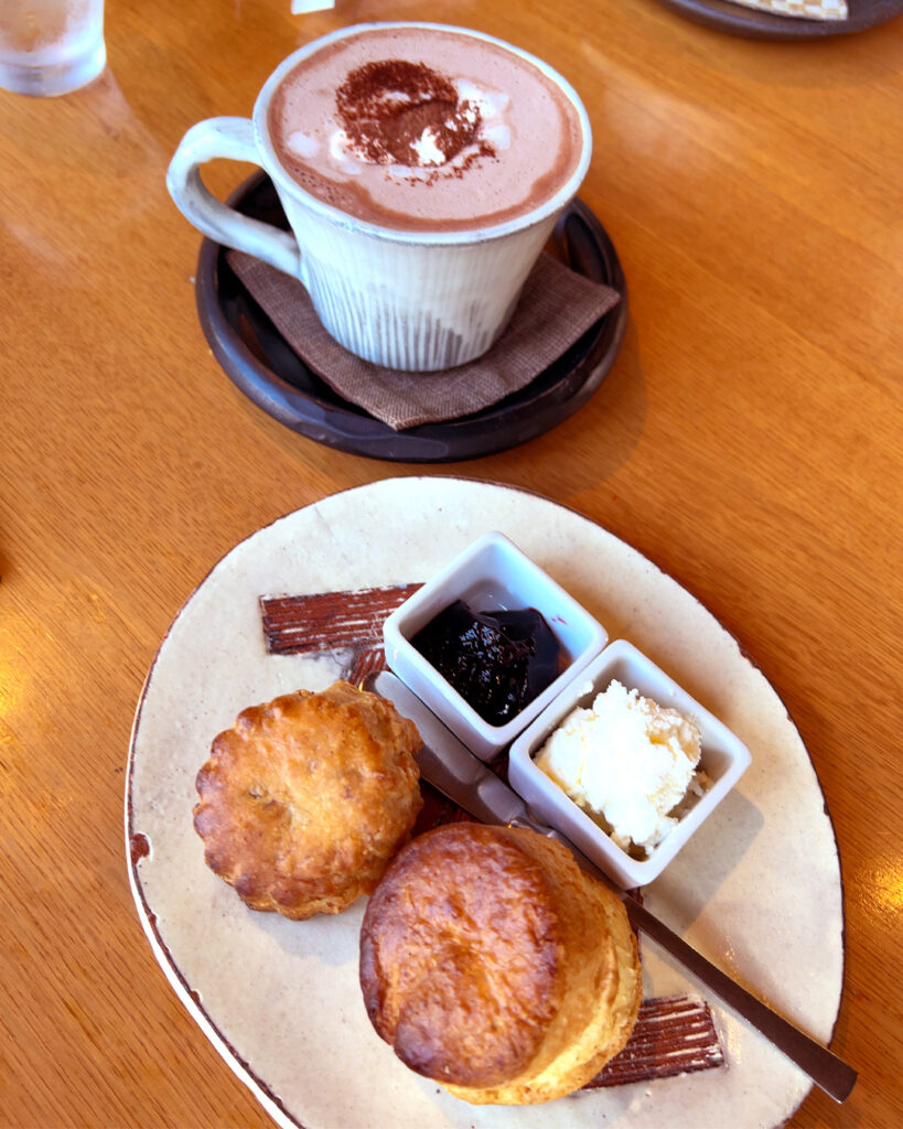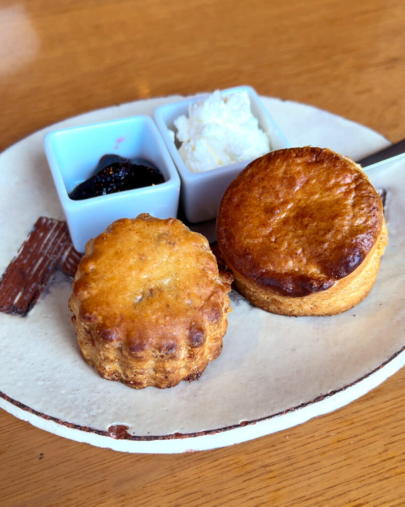 手作りスコーンにはホイップとジャムがセットで、温かくてサクっとした食感が心地いい。